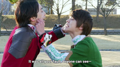 Blame game! Blame game! Well Towa won't easily join in either. What happeneth is that Towa and Koh blame each other until they are cut short by Banba. Banba may be a jerk but he's a Jerk with a Heart of Gold. Remember those tropes like black rangers like Shou Hayate, Gai Yuki, Masumi Inou and Ian Yorkland?